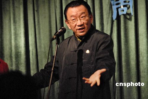 资料图:1月3日晚8时,著名曲艺演员侯耀华与金文和在深圳最大的茶艺馆——聚福茶艺馆合说相声《DNA》和《取名》,令数百名观众捧腹不已。 中新社发田友泉摄