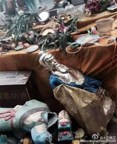有人用挖掘机将道观以及道观内所供奉的神像铲毁。