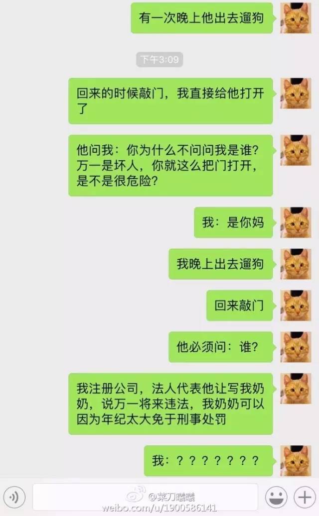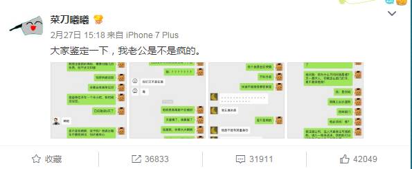 前天下午,网友@菜刀曦曦在微博上发了四张聊天记录,向好友“控诉”老公的数条“症状”,结果引来3万多网友的评论和转发!