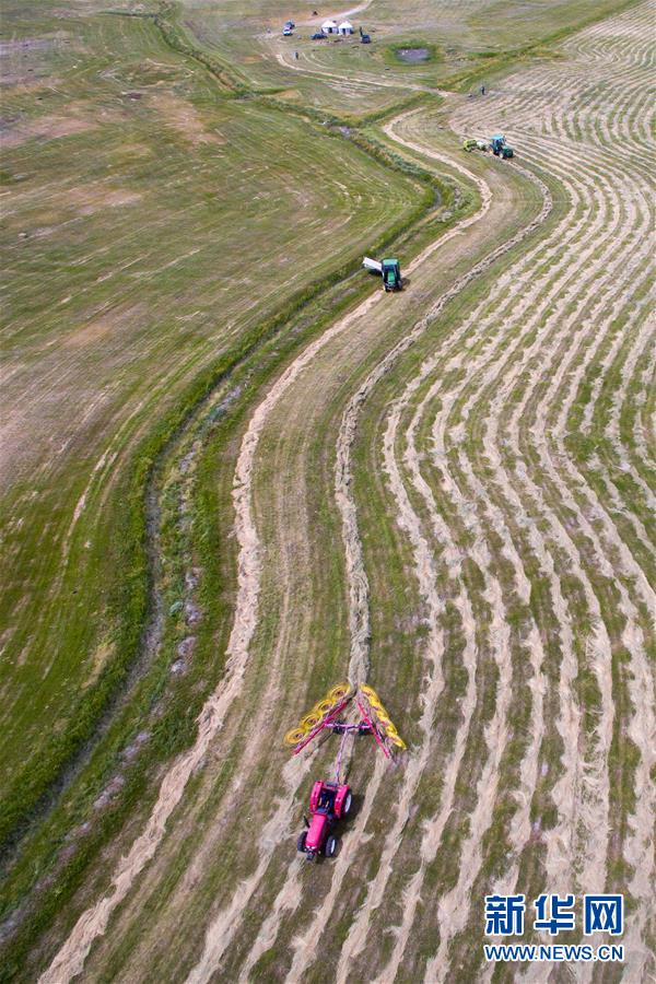 7月31日,一辆拢草机(前)在草原上拢草。