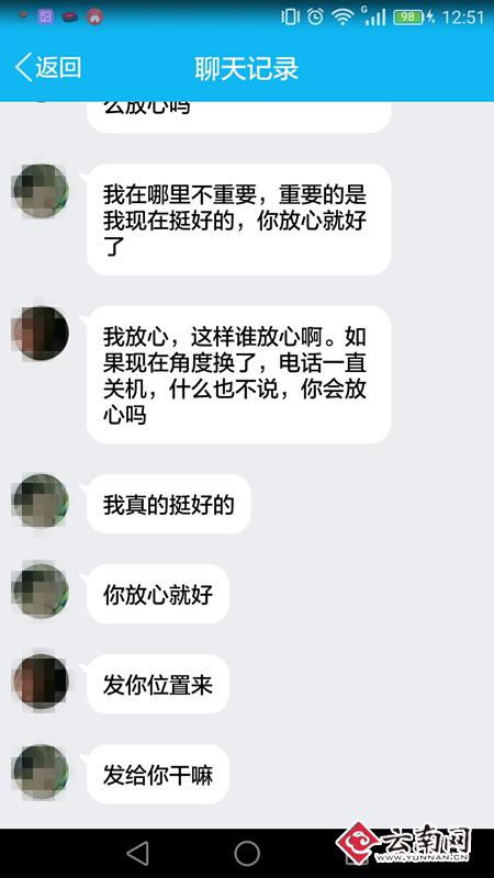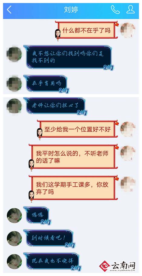 云南网了解到,虽然目前刘婷的手机显示关机状态,但陈老师和小余都能通过QQ联系上对方。聊天记录显示,刘婷反复强调自己很好,不用担心,但当陈老师和小余问及其目前所在具体位置时,刘婷却不愿回答,而且发送的视频电话也均被刘婷挂断。陈先生怀疑,这段时间以来的QQ消息并不是女儿自己所发。