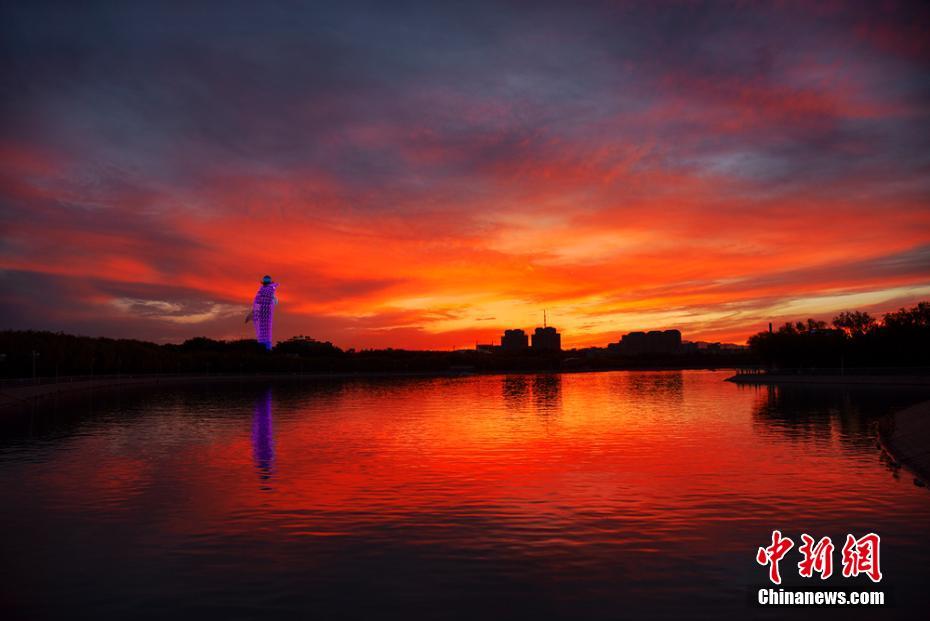 连日来,甘肃省嘉峪关市频频出现火烧云景观,日落时分,嘉峪关东湖生态旅游景区、南湖文化生态园等景点,霞光万丈,水天一色,让游客和当地居民赞叹不已,纷纷聚焦这迷人景象,拍照留念。师永红摄