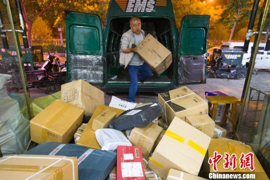 资料图:物流业工作人员正在给快递卸车。张云摄