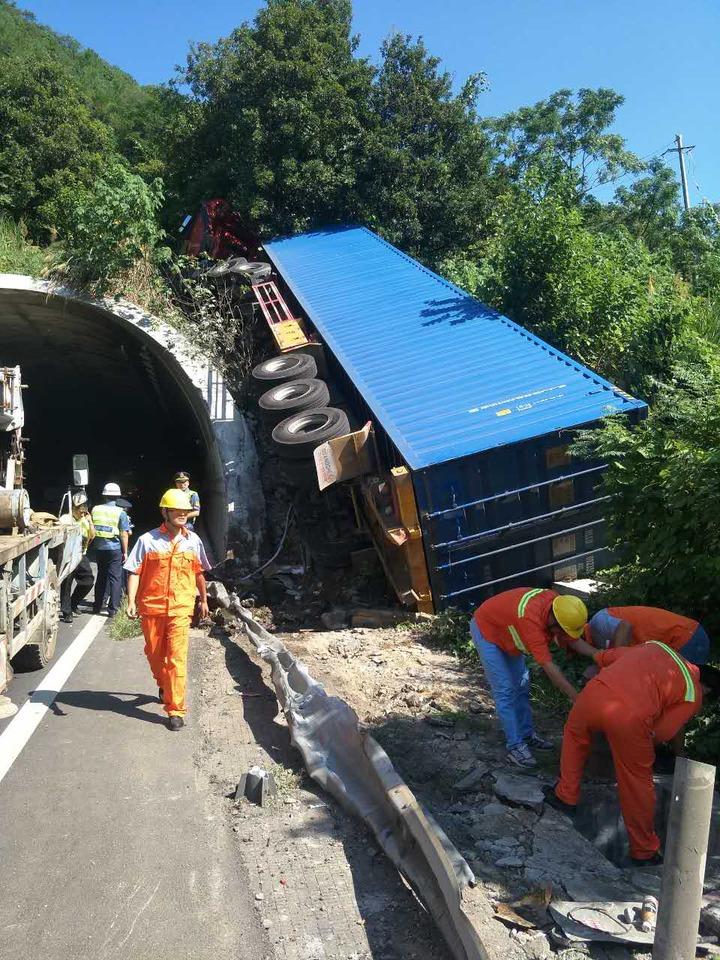 9月6日,浙江台州G15沈海高速麻岙岭隧道南洞口路段发生一起惊险车祸:一辆安徽牌照的集装箱运输车在行驶中突然失控,撞上隧道右侧的山体后,整辆车侧翻“骑”在山体上。司机目前并无生命危险。来源:浙江在线