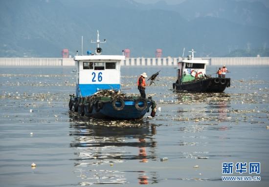 资料图:清漂工人在三峡坝前湖北省秭归县客运港水域打捞漂浮物。