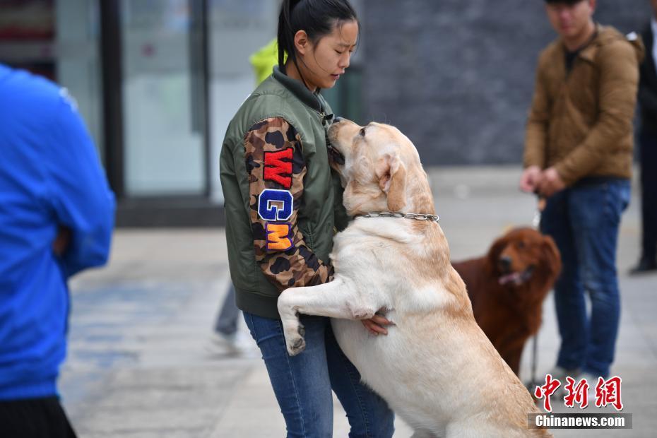 9月28日,一只拉布拉多和主人撒娇。当日,云南昆明的犬主举行聚会,交流养宠心得,展示训练成果,并向市民宣传文明科学养犬理念。中新社记者刘冉阳摄