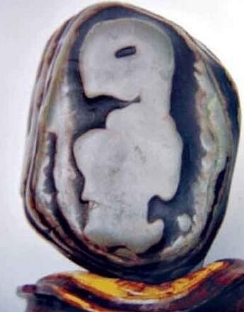 这块奇石高15厘米,宽13厘米,厚度为8厘米,石质细腻,通体四周是黑白相间的条纹框,框内画面是一个惟妙惟肖的还处于早期胚胎阶段的胎儿形象,眼睛已经发育,其它器官以及四肢尚不明显。整个形象犹如静静蜷坐在母腹中熟睡的婴儿。