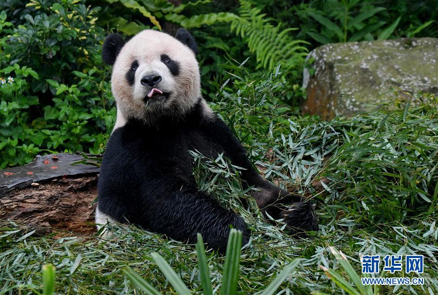 5月6日,大熊猫“团团”在台北动物园熊猫馆吃竹叶。新华社记者张国俊摄