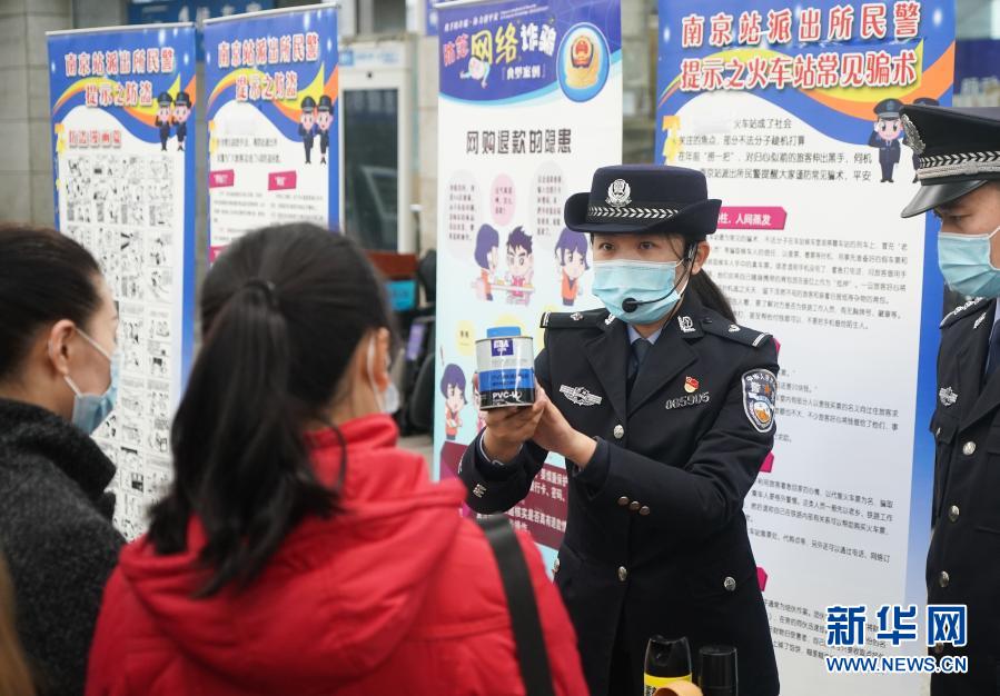 南京铁路公安处南京站派出所民警在站内开展迎元旦安全主题宣传活动,普及铁路安全乘车、“防盗防骗”知识,为旅客平安出行保驾护航。