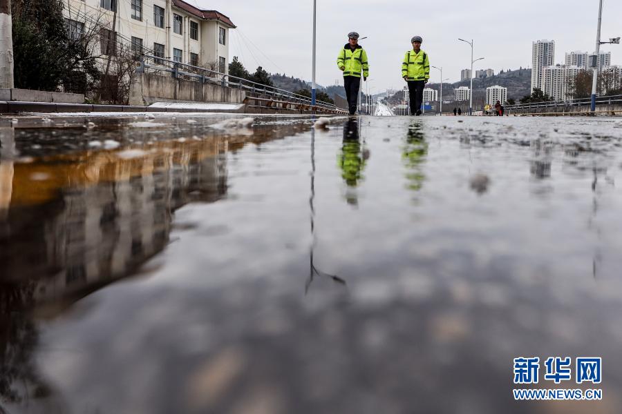1月11日,交警在盘州市蛾螂铺大桥上对已经完成撒盐除冰作业的路面进行巡查。新华社记者欧东衢摄