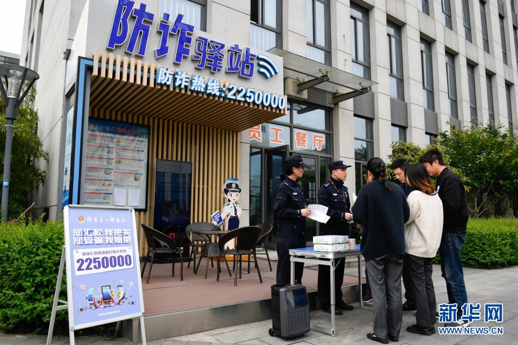 4月15日,湖州市吴兴区公安分局高新园区派出所民警在中节能(湖州)环保产业园内设立的防诈驿站为群众宣教防诈骗知识。