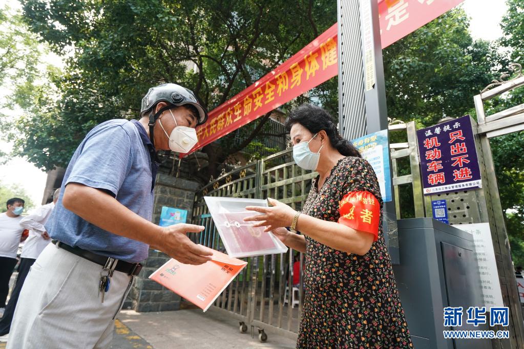 8月10日,在南京市建邺区南苑街道吉庆家园小区门前,马维珍将一户居民的小孩上学报名材料送出。新华社记者季春鹏摄