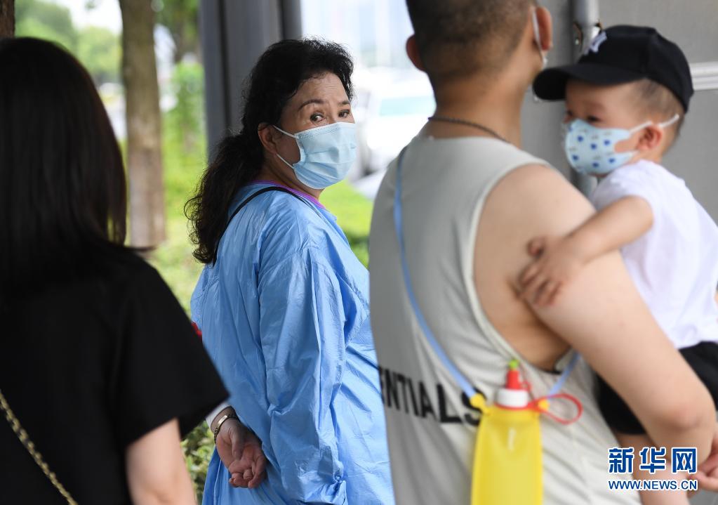 8月10日,在南京市儿童医院门前,陪同孩子看完病的马维珍(左二)和居民等待专用车辆返回小区。新华社记者季春鹏摄