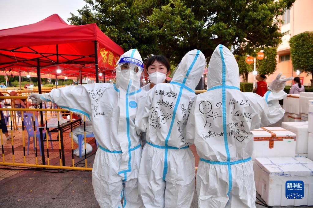 9月16日,在厦门市湖里区金尚小区核酸检测点,厦门市金尚中学几名教师志愿者在一起合影。
