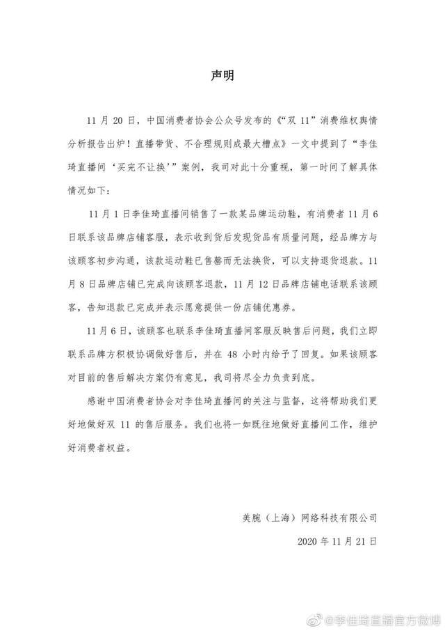11月21日,针对中国消费者协会发布的“双11”消费维权舆情分析报告中案例:李佳琦直播间“买完不让换”,@李佳琦直播官方微博回应称,消费者曾在11月6日将问题反映给品牌方和李佳琦直播间,厂商因为当时货品已售完无法换货,进行了退款,直播间一直与品牌方积极协调做好售后。如果对目前的售后解决方案仍有意见,会负责到底。